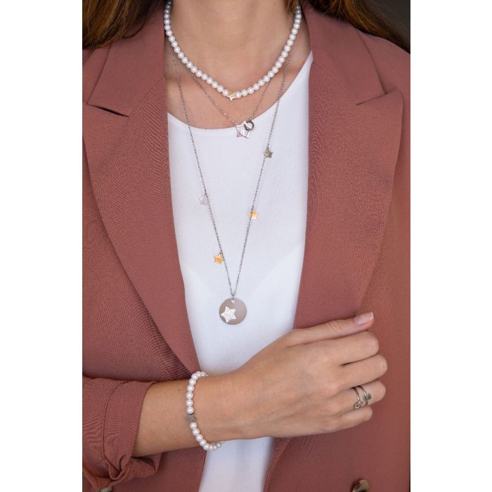 *Colar feminino Luca Barra com placa de aço e estrelas.*Placa de aço com estrela com cristais brancos. Estrelas em aço e aço rosé.*Comprimento: 75 + 5 cm*Diâmetro do pendente: 24 mm